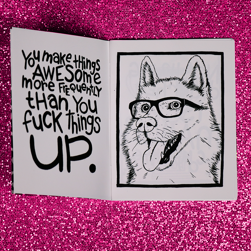 Contains 12 positive affirmations with corresponding illustrations. About 25 pages long. Don't buy it for your grand-kids because it has some swear words in it.